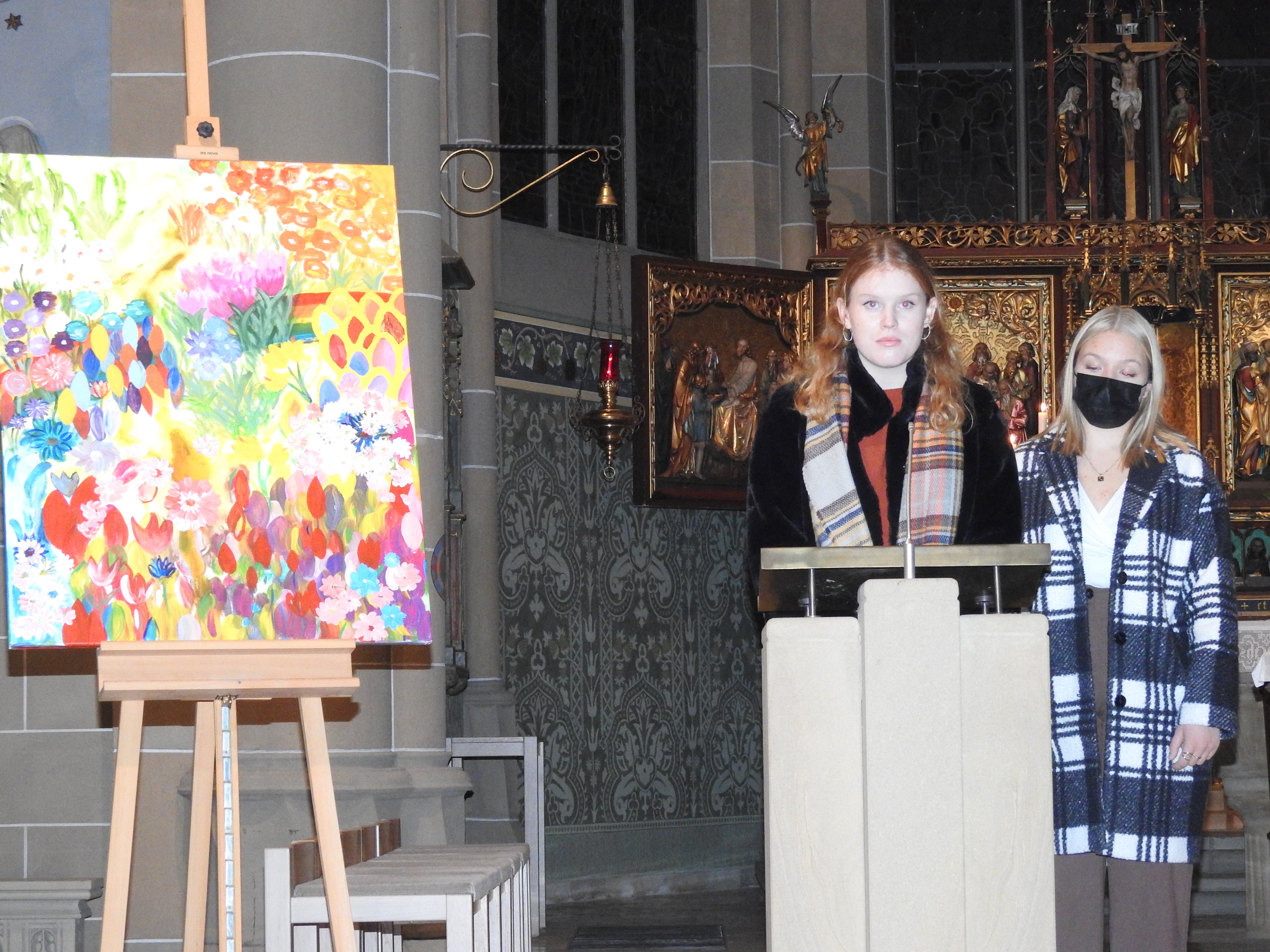 Mit Worten von Dietrich Bonhoeffer stellten Paula Bohr (links) und Emily Selzer eine Beziehung zwischen gemeinsam geschaffenen Kunstwerken aus dem Emanuel-Felke-Gymnasium und dem Gedenken an die jüdischen Opfer des Nationalsozialismus her.