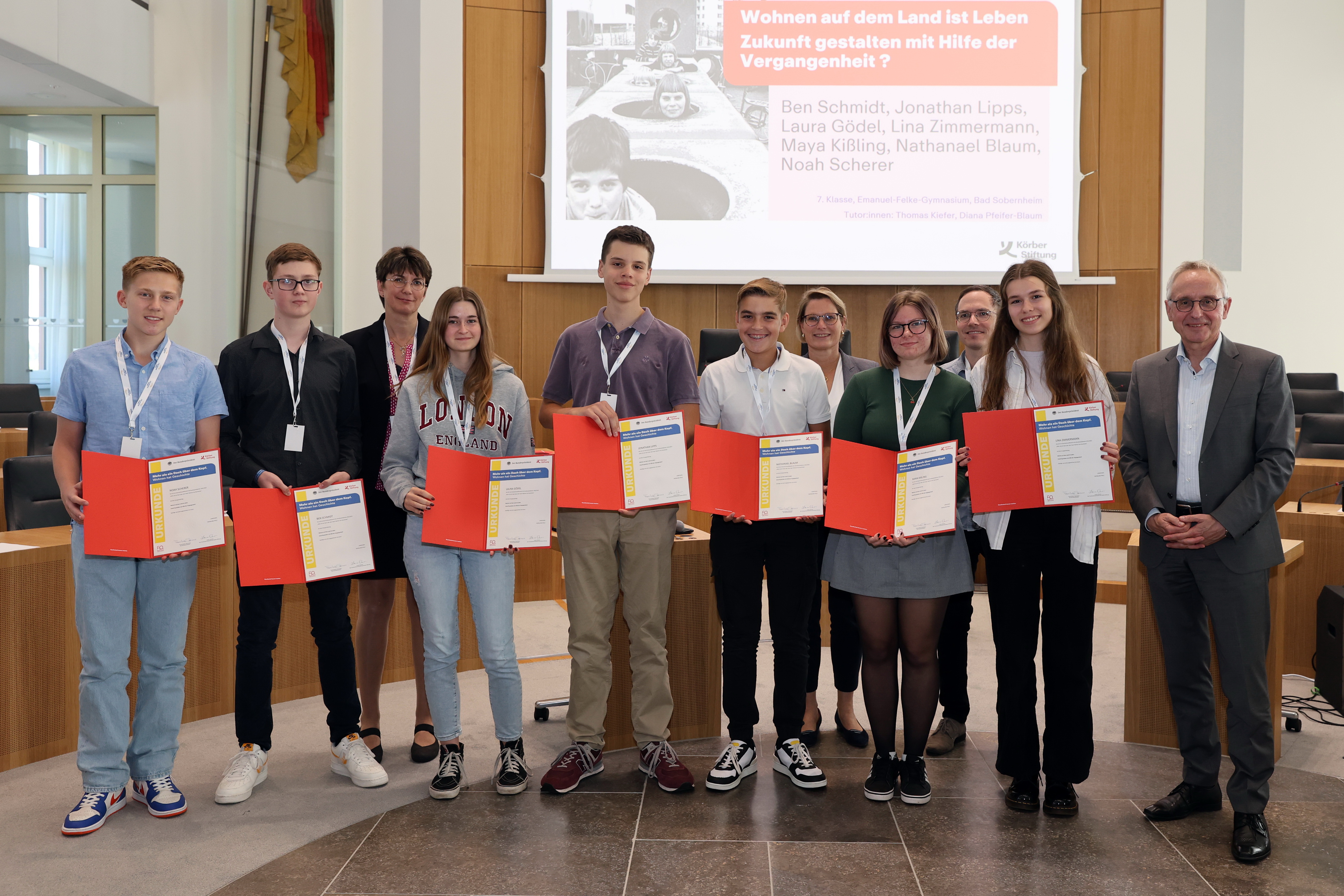 Preisträger*innen sind: Nathanael Blaum, Laura Gödel, Jonathan Lipps, Maya Kißling, Noah Scherer, Ben Schmidt und Lina Zimmermann. Als Tutor*innen haben Herr Kiefer und Frau Pfeifer-Blaum die Gruppe angeleitet. Von dem Preisgeld wurden den Zeitzeugen die Begleitbände gedruckt, zudem sollen noch technische Hilfsmittel für die künftige Spurensuche angeschafft werden.
