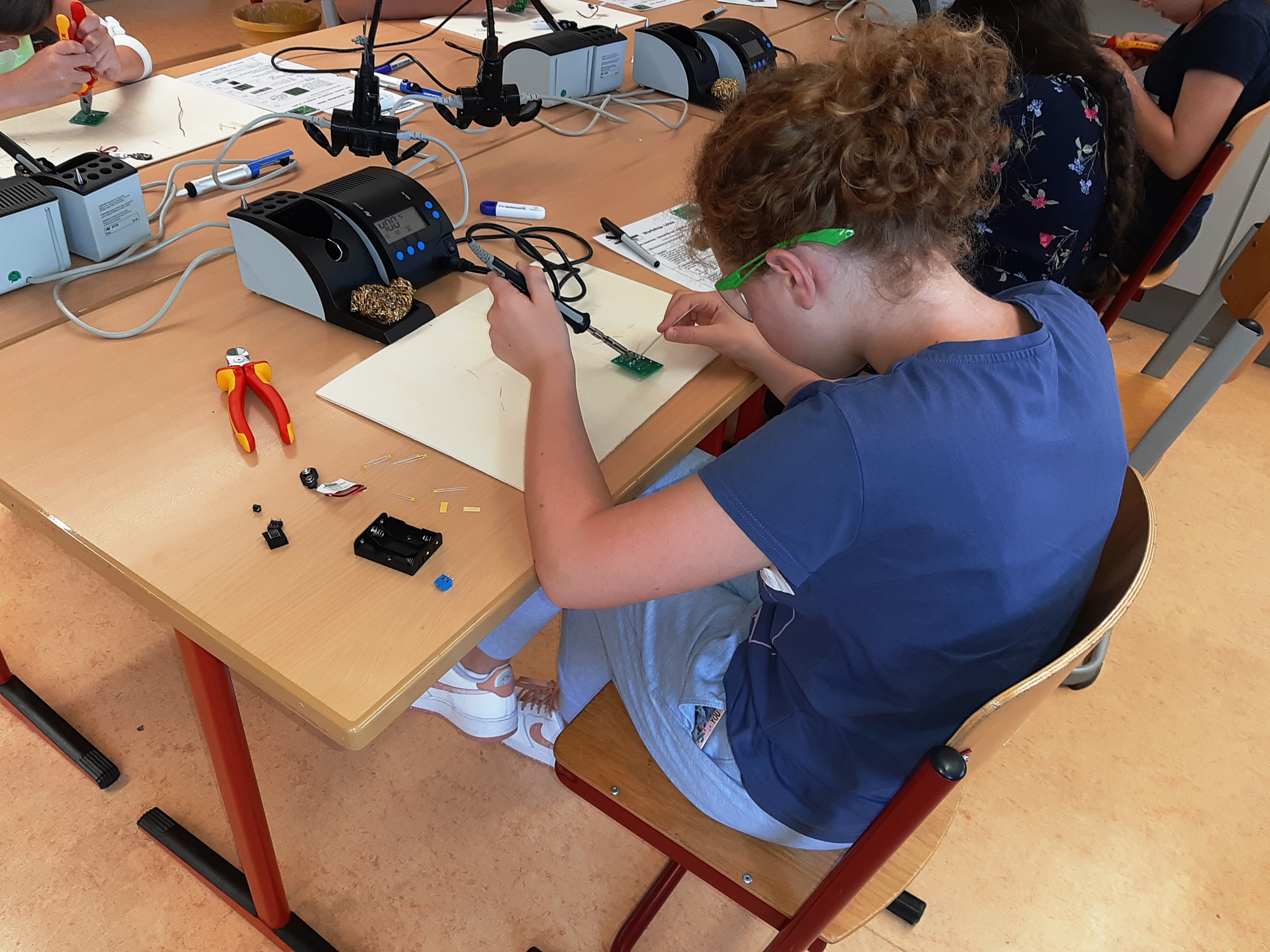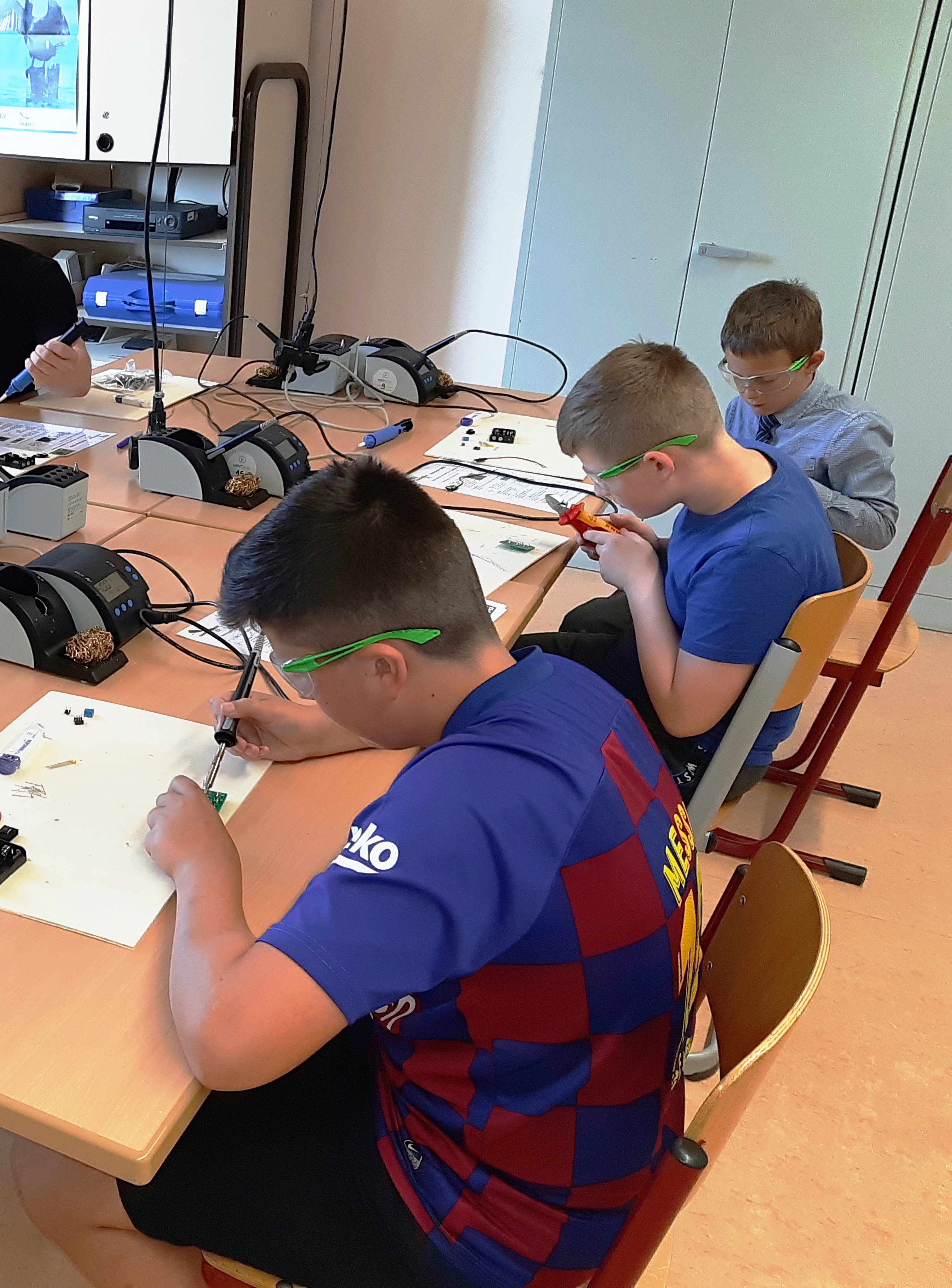 Schülerinnen und Schüler der 5. Klassen nehmen an den Workshops „Robotik“ und „Löten“ teil