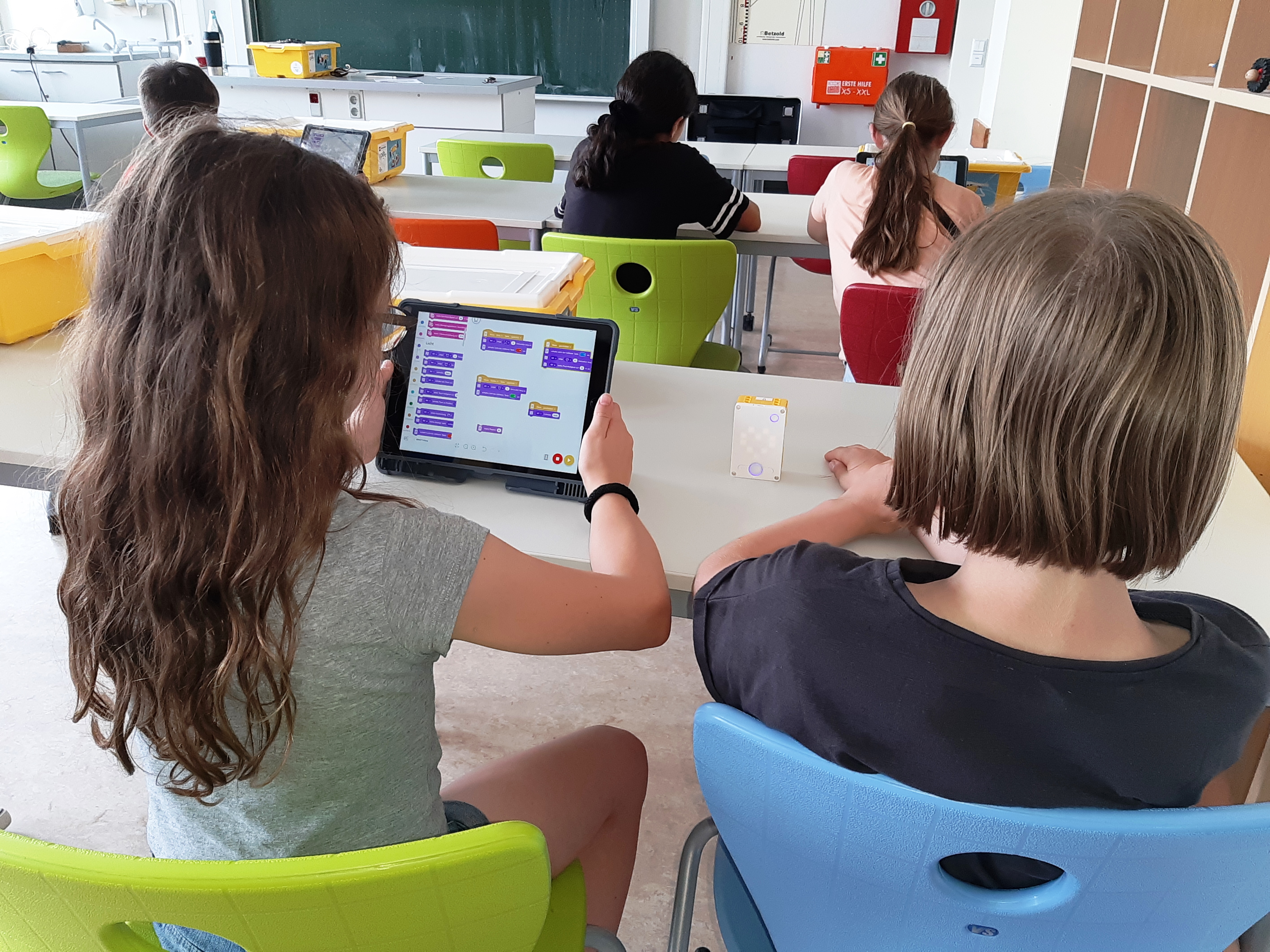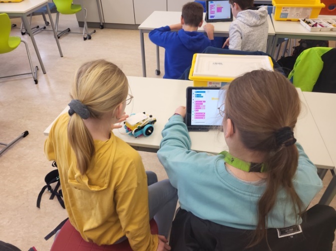 Im Workshop Robotik bauten die Schüler:innen ein Fahrzeug aus der LEGO Education SPIKE Prime-Serie. Dabei wurde zum einen die Umsetzung einer 2D-Anleitung in das 3D-Modell geübt und zum anderen die Handhabung der digitalen Endgeräte als Arbeitsmittel. Nach einer kurzen Einführung in die LEGO-eigene Programmier-App, lag es an den Schüler:innen die Fahrzeuge so zu programmieren, dass sie bestimmte Aufgaben lösten. Dazu gehörten bspw. „Fahre im Viereck um den Tisch”, „Ändere die Displayanzeige auf...“. War die Aufgabe gelöst, prüften die Schüler:innen ihre Programmierung und überlegten, wie diese geschickter geschrieben werden könnte, z.B. unter Einbezug einer Wiederholfunktion. So lernten die Schüler:innen auf spielerische Art und Weise das Handwerkszeug eines jeden Programmierers kennen.