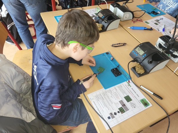 Im zweiten Workshop löteten die Schüler:innen einen vorgegebenen Bausatz zusammen. Hier war nicht nur Vorsicht geboten, sondern auch höchste Konzentration. Mit ausreichend Feingefühl und motorischem Geschick wurden einzelne Bauteile wie Leuchtdioden, Widerstände und Schalter auf einer Platine mit Lötzinn befestigt. Am Ende erhielten die Schüler:innen einen voll funktionsfähigen elektronischen Würfel, den sie mit nach Hause nehmen konnten.